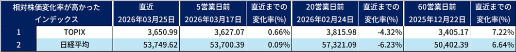 • TOPIX : 3,650.99pts。5営業日前対比で0.66%の上昇。