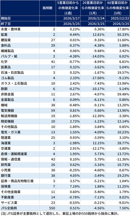 (出所) Quick AstraManagerの個別株価・時価総額データに基づき、 JTG証券が主要銘柄として選別したJPX上場の計550銘柄から独自に集計。