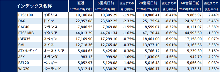 欧州の主要株式インデックス一覧: