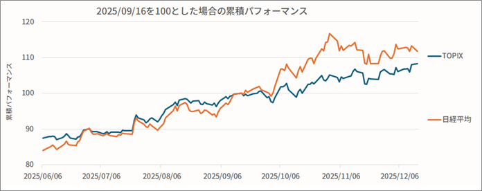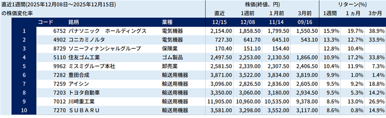 - TOPIX : 3,431.47pts。5営業日前対比で1.39%の上昇。