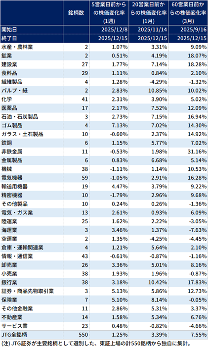 (出所) Quick AstraManagerの個別株価・時価総額データに基づき、 JTG証券が主要銘柄として選別したJPX上場の計550銘柄から独自に集計。