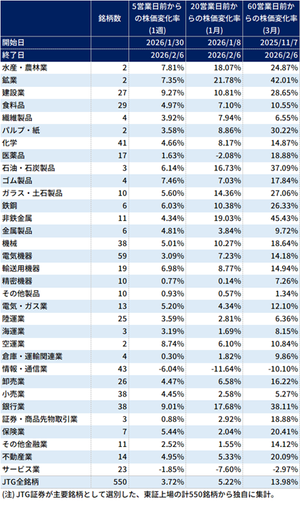 (出所) 東証業種指数はQuick AstraManagerを介した公表値。JTG集計の単純平均指数については、Quick AstraManagerからの個別株価・時価総額データに基づき、 JTG証券が主要銘柄として選別したJPX上場の計550銘柄から独自に集計。