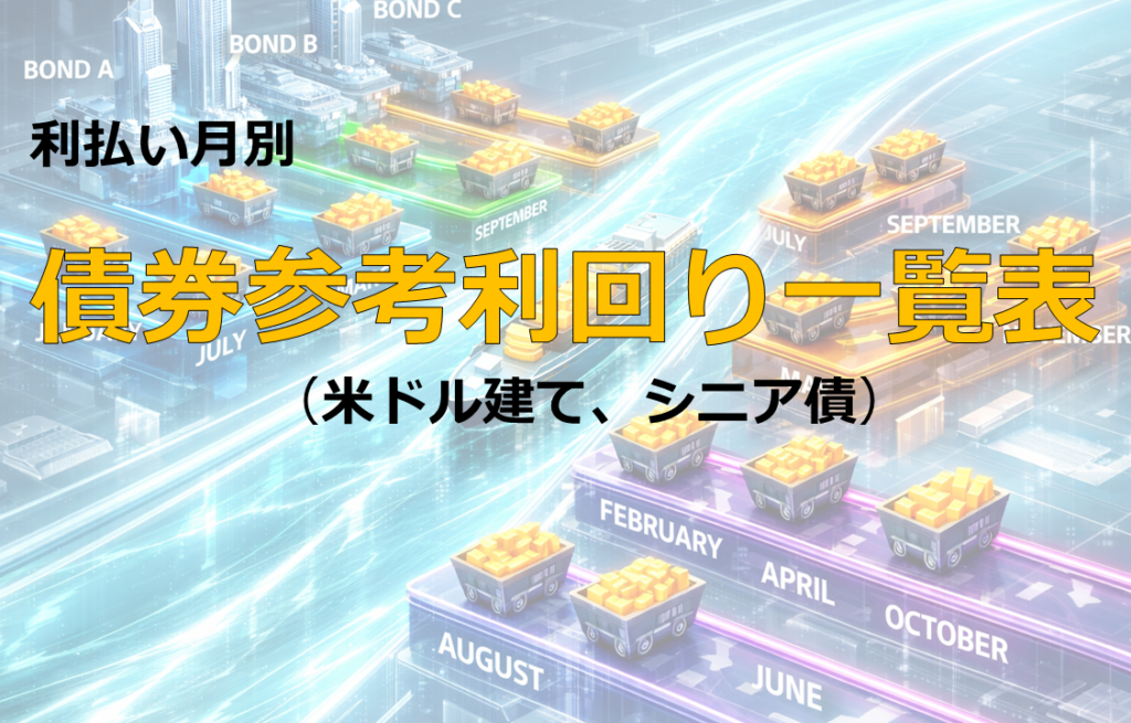 利払い月別 債券参考利回り一覧表」では、各利払い月毎に整理した、個人が購入可能な米ドル建てシニア債を例示しています。