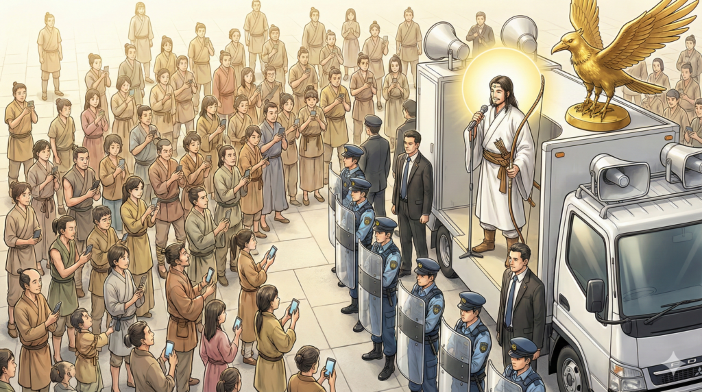 しかし、部下である軍人や官僚だけではなく、一般民衆も取り込まなければ、国を一つにまとめることはできません。そこで彼が用いたのが、「ことば・儀礼・文化」による統合です。いわば、「軍と民を“同じ物語”にまとめる」という手法です。例えば、各地を巡幸する国見によって国の姿を言語化し、民衆の前で国号を新たにつけることで地域の一体化を図りました。また、来目歌(久米歌)を軍人と民衆の共通のメディアとして活用し、勝利祈願や士気鼓舞、宴席での合図(歌声を合図に一斉行動)などで用いることで、集団を統率する“メディア”として活用していました。さらに、「正しい言葉(諷歌・倒語)」を用いれば妖気を払うことができるとして、正しい言葉(権威)を、国の統治手段として利用しました。